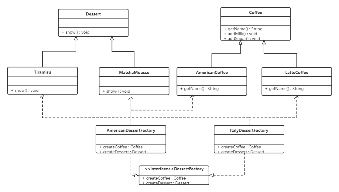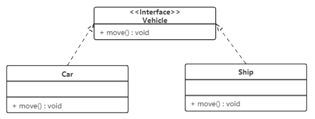 在 UML 类图中,实现关系使用带空心三角箭头的虚线来表示,箭头从实现类指向接口。例如,汽车和船实现了交通工具,其类图如图 9 所示。