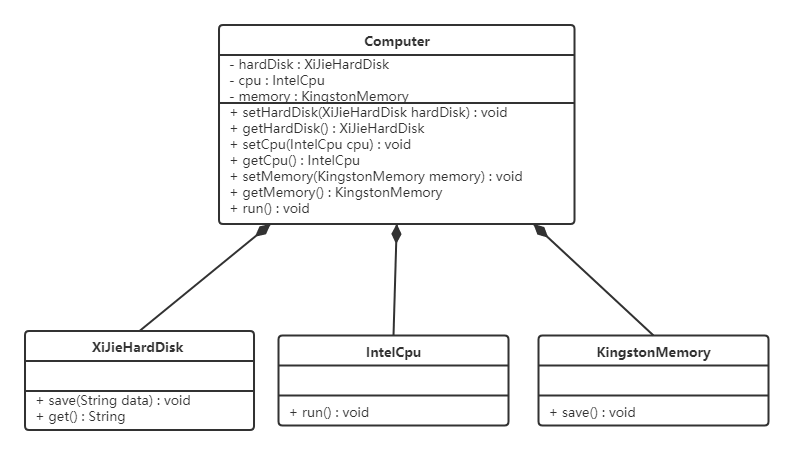 在 UML 类图中,组合关系用带实心菱形的实线来表示,菱形指向整体。下图所示是头和嘴的关系图: