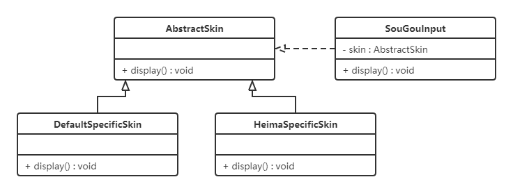 分析:搜狗输入法 的皮肤是输入法背景图片、窗口颜色和声音等元素的组合。用户可以根据自己的喜爱更换自己的输入法的皮肤,也可以从网上下载新的皮肤。这些皮肤有共同的特点,可以为其定义一个抽象类(AbstractSkin),而每个具体的皮肤(DefaultSpecificSkin和HeimaSpecificSkin)是其子类。用户窗体可以根据需要选择或者增加新的主题,而不需要修改原代码,所以它是满足开闭原则的。