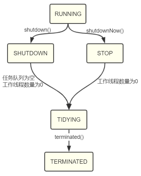关闭线程池使用shutdown方法或shutdownNow方法,最终目的是将线程池状态设置成TERMINATED。